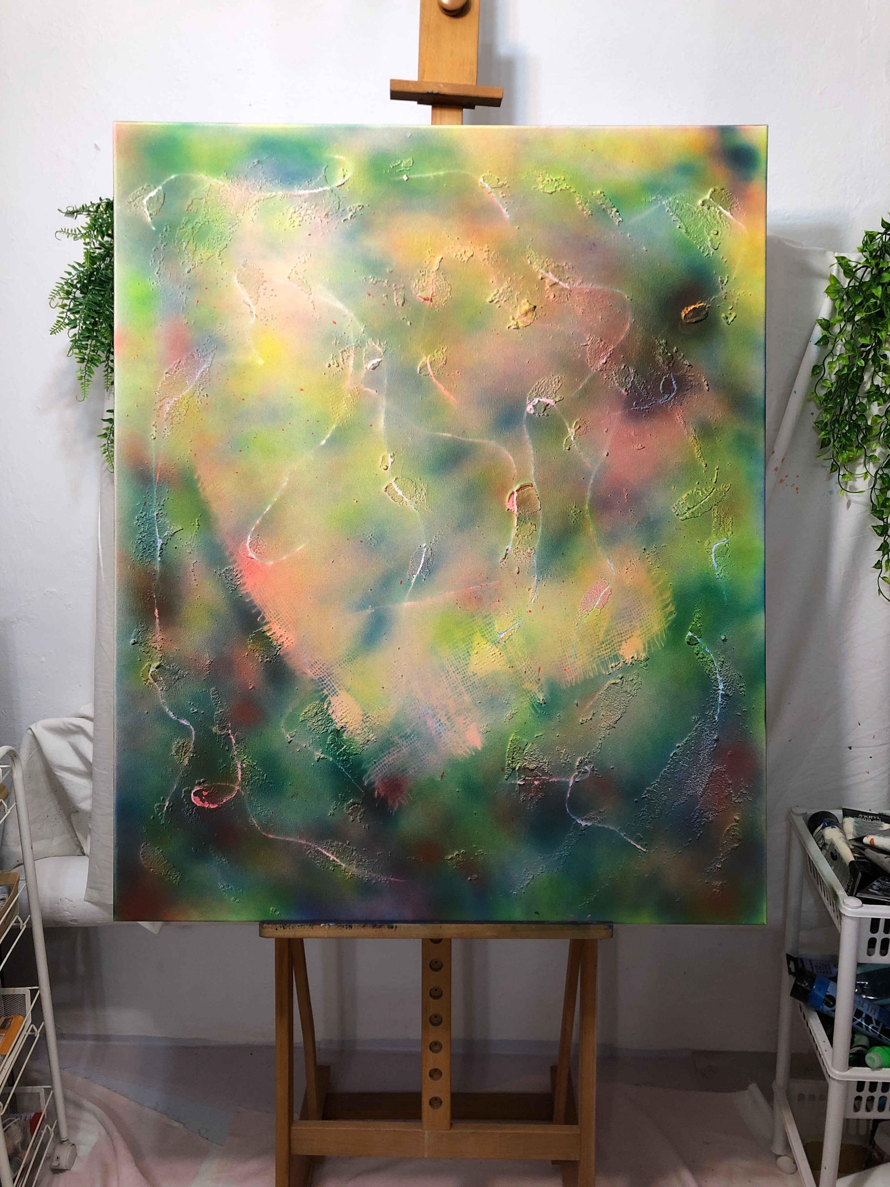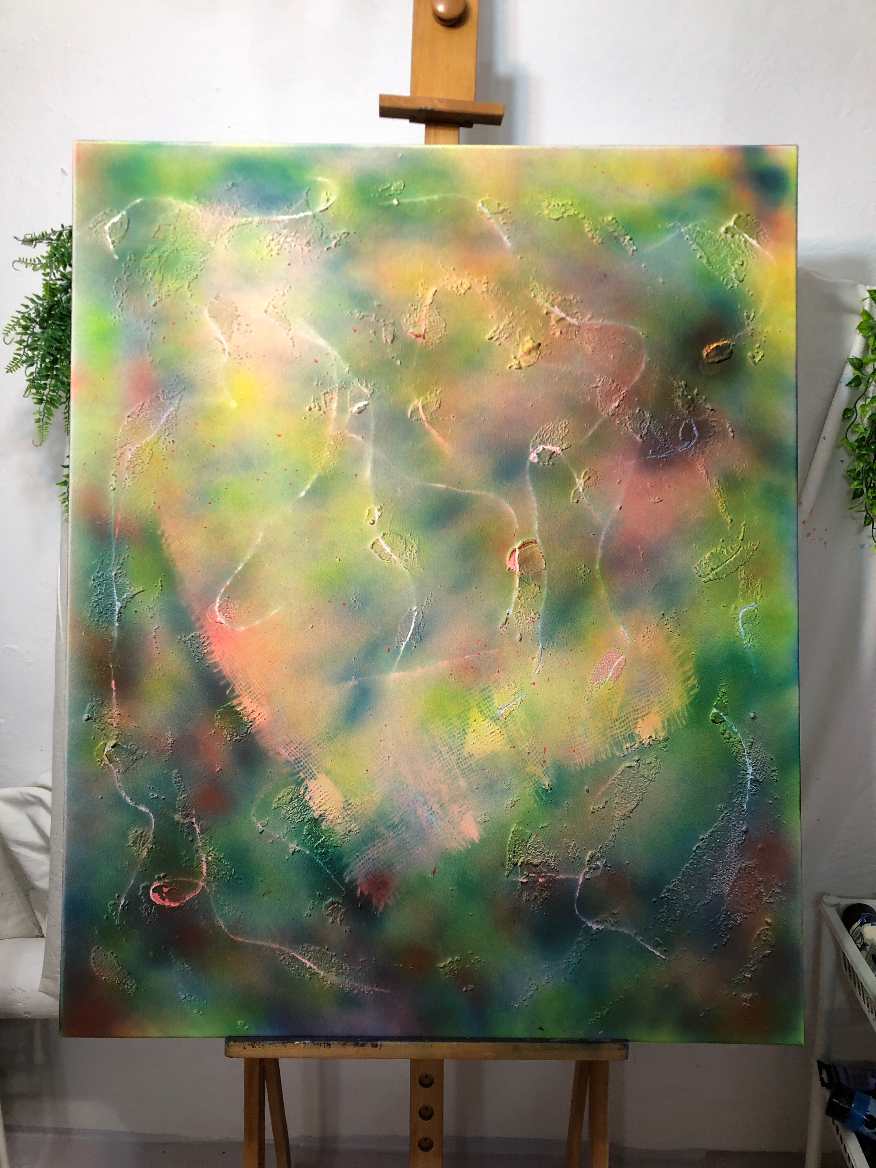 Farby w sprayu, pasta strukturalna. Obraz namalowany na płótnie bawełnianym. Blejtram wykonany z lekkiego drewna sosnowego. Boki obrazu zamalowane, dzięki czemu nie wymaga zakupu ramy.
