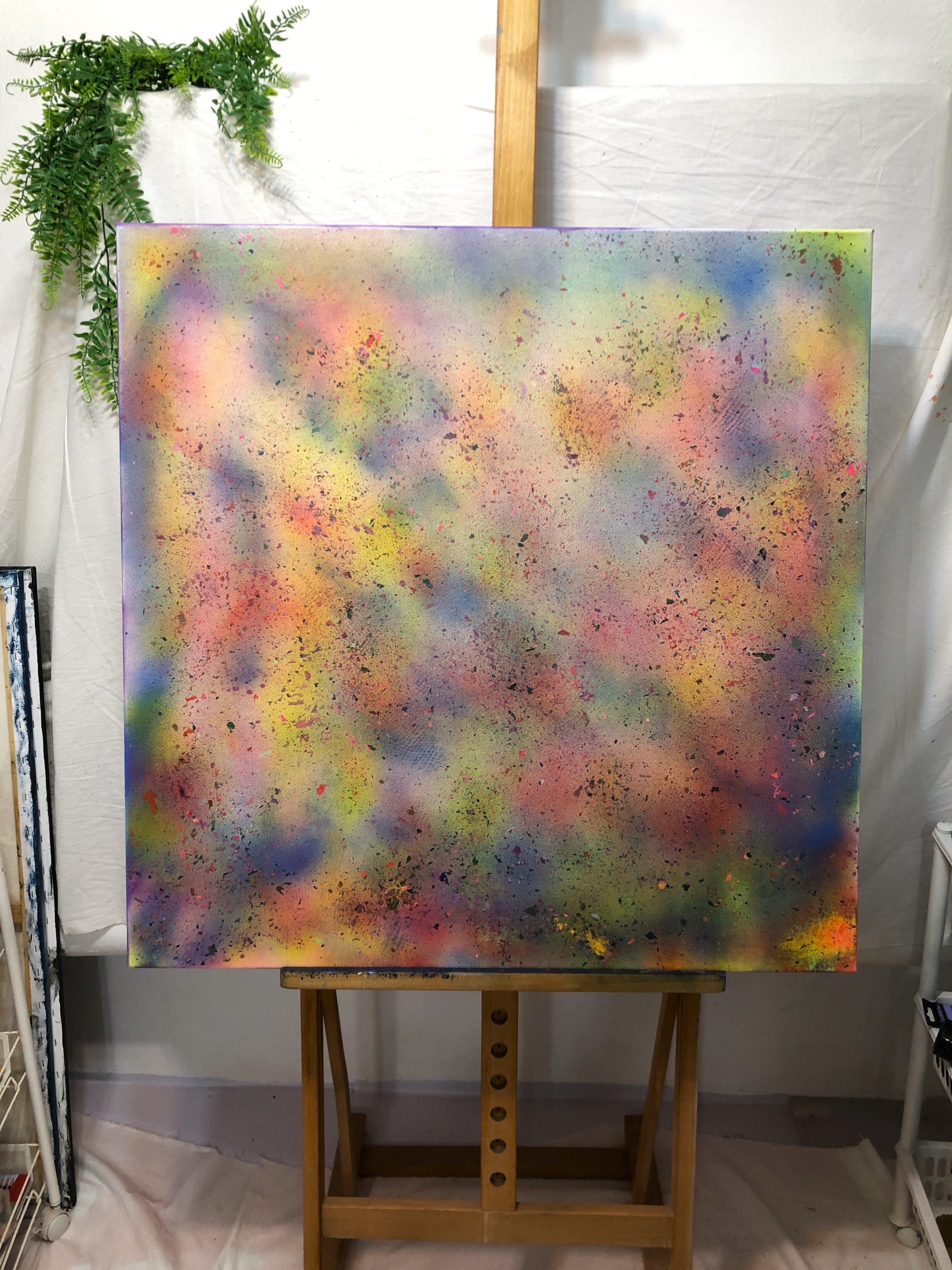 Farby w sprayu. Obraz namalowany na płótnie bawełnianym. Blejtram wykonany z lekkiego drewna sosnowego. Boki obrazu zamalowane, dzięki czemu nie wymaga zakupu ramy.