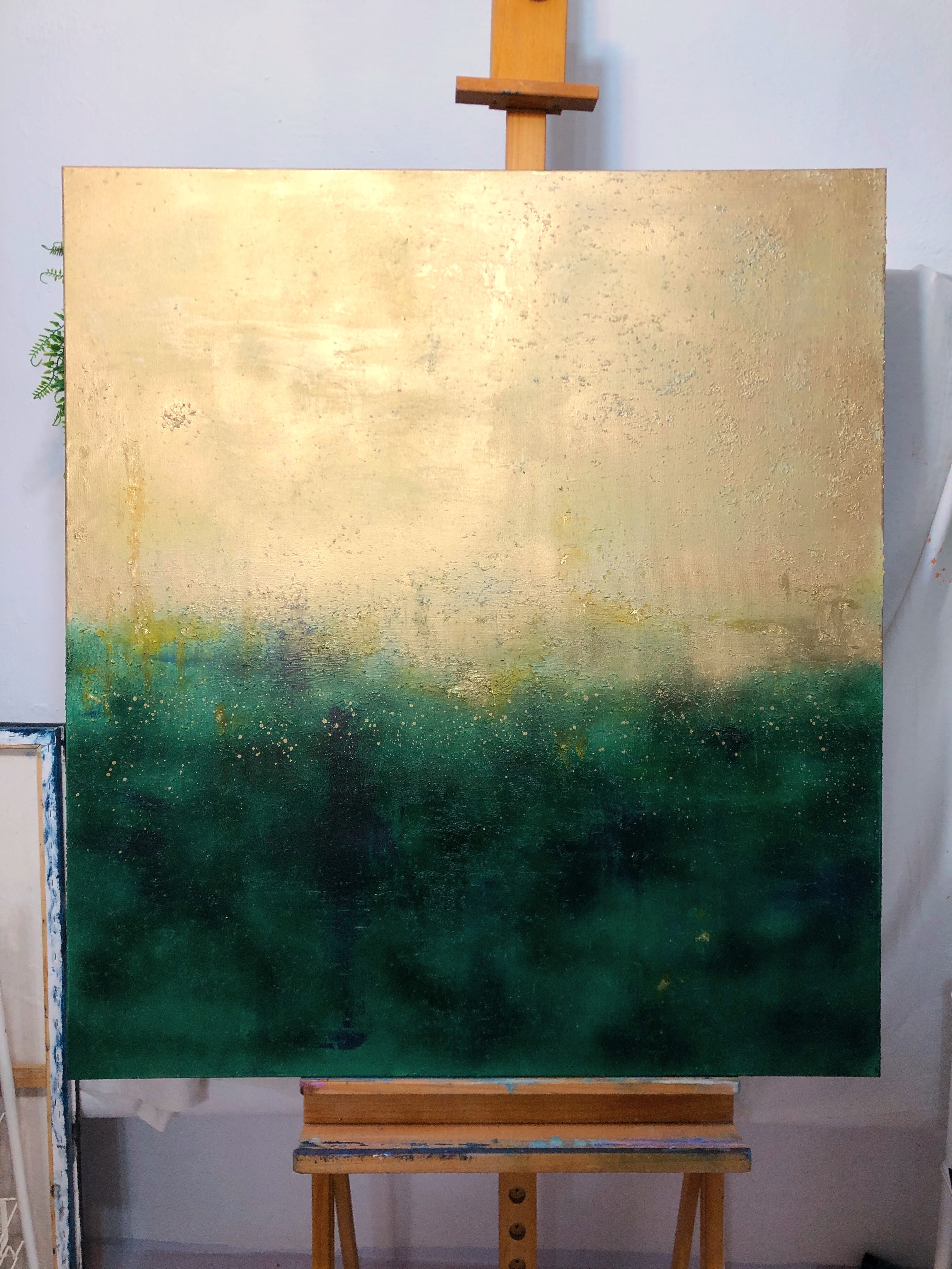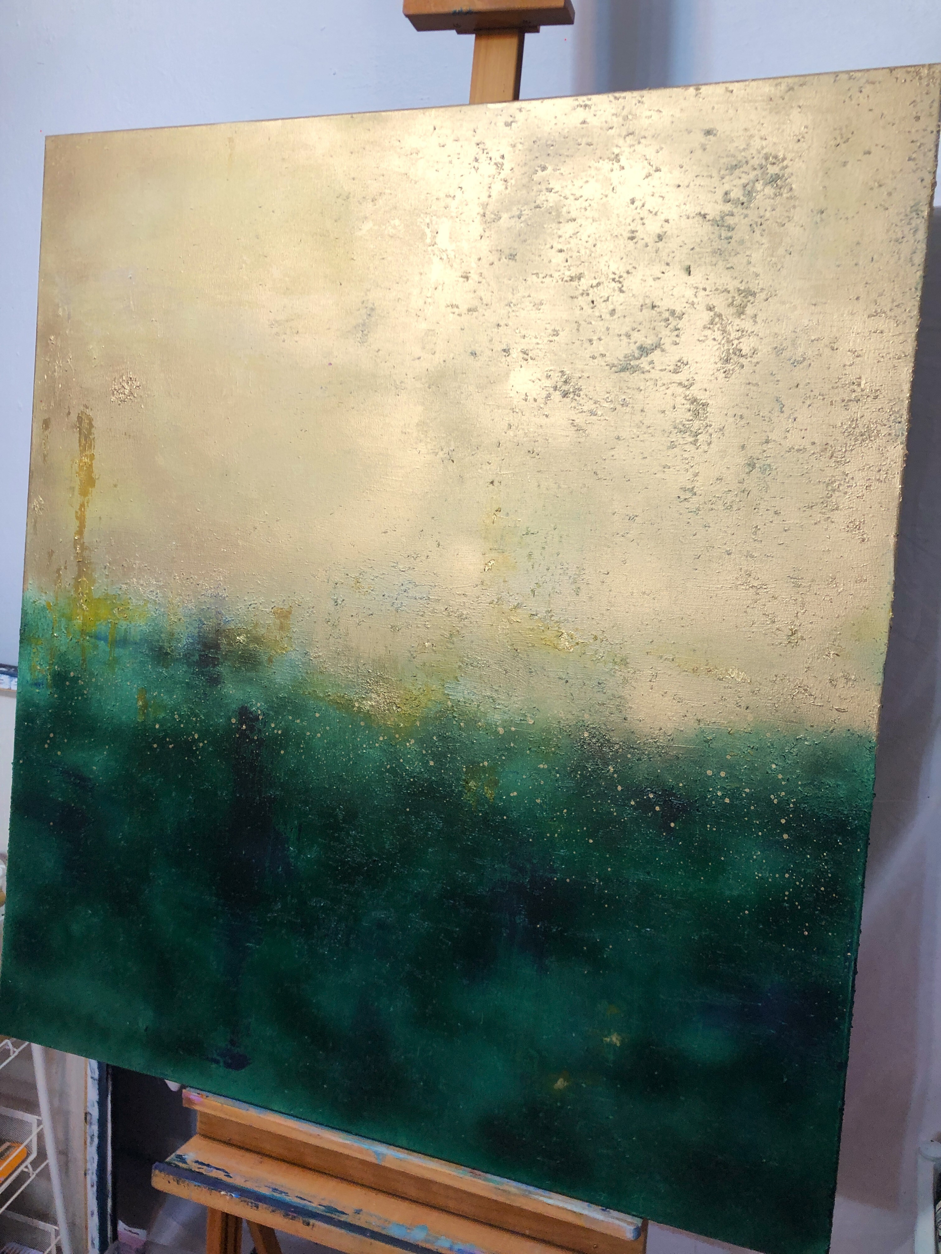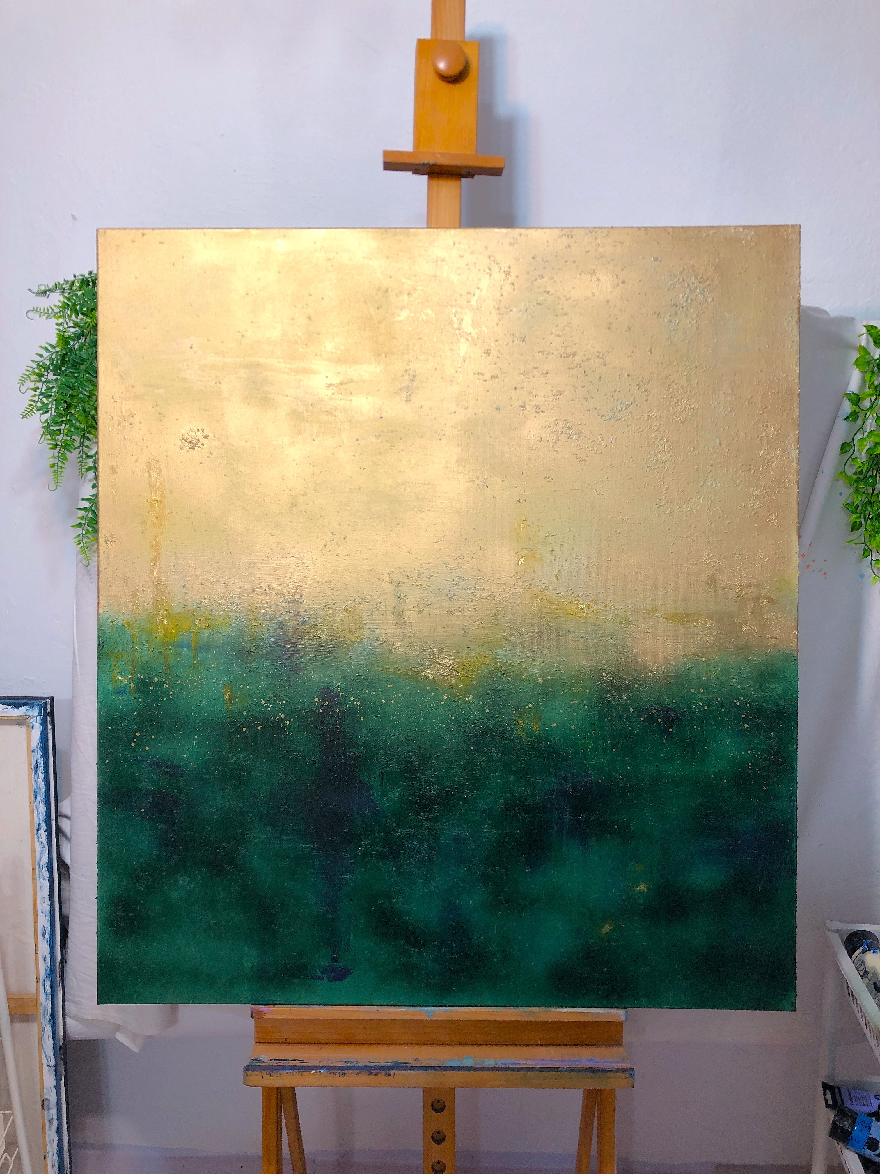 Akryl, szlagmetal (złoto w płatkach). Obraz namalowany na płótnie bawełnianym. Blejtram wykonany z lekkiego drewna sosnowego. Boki obrazu zamalowane, dzięki czemu nie wymaga zakupu ramy.