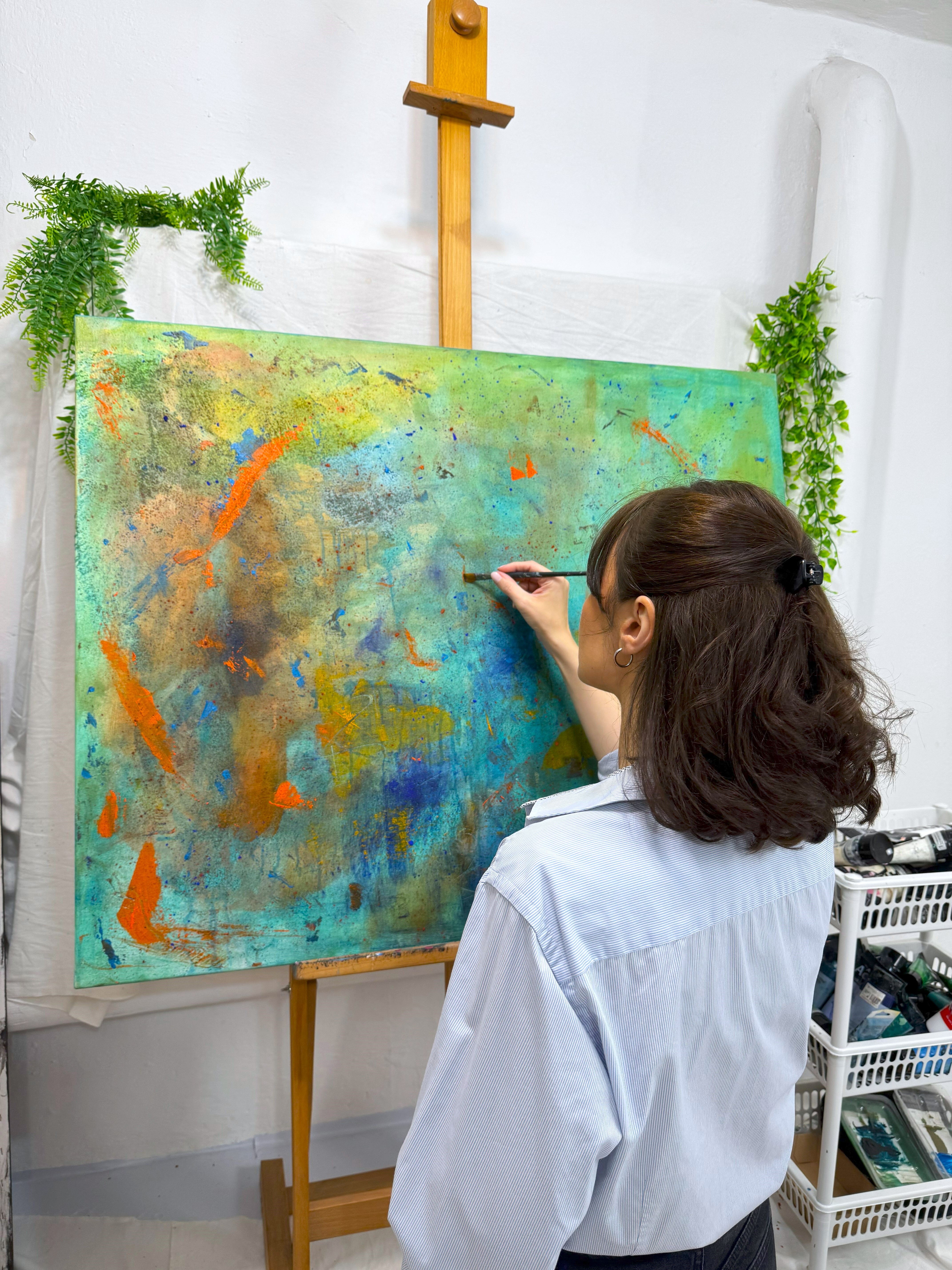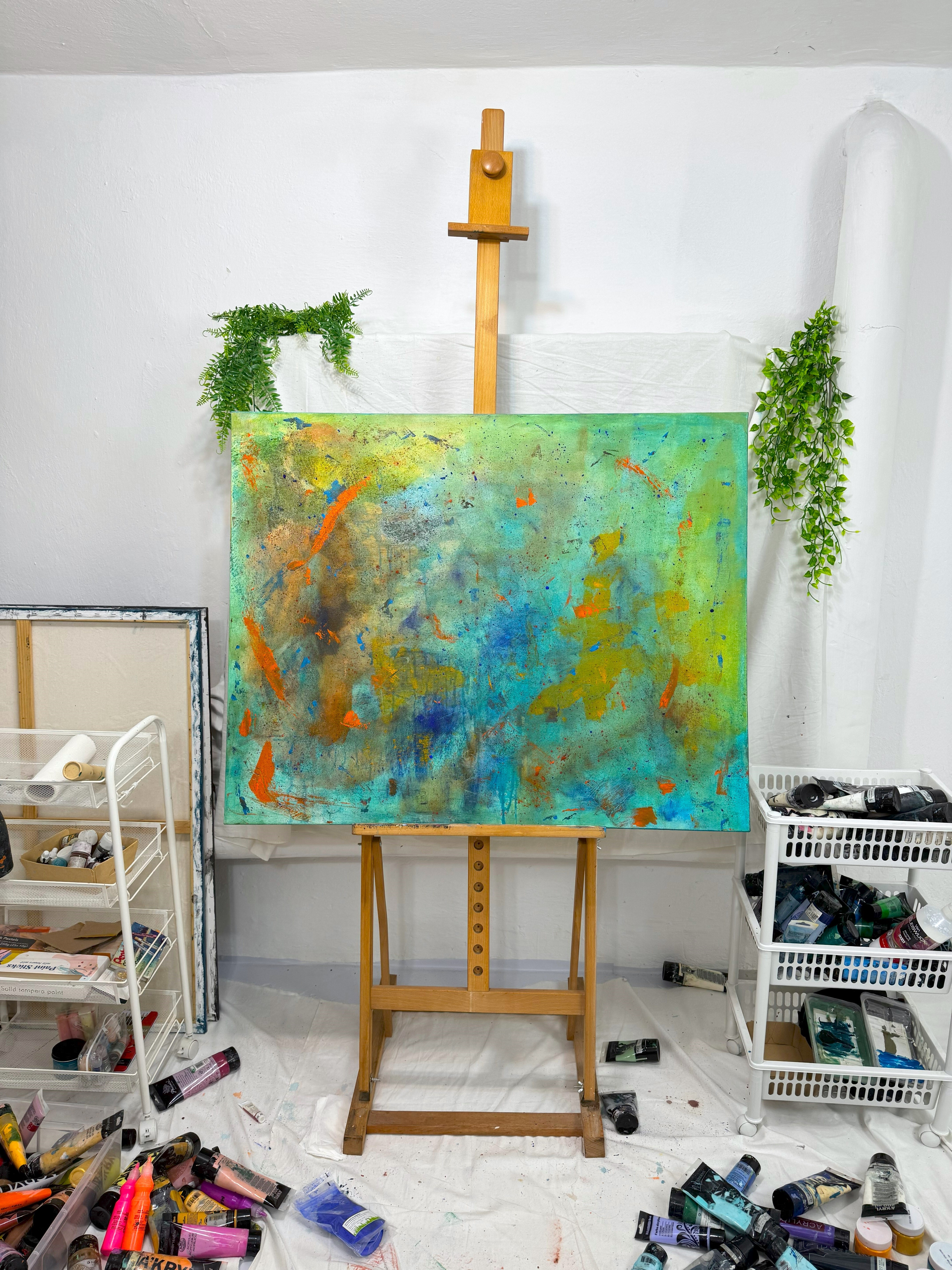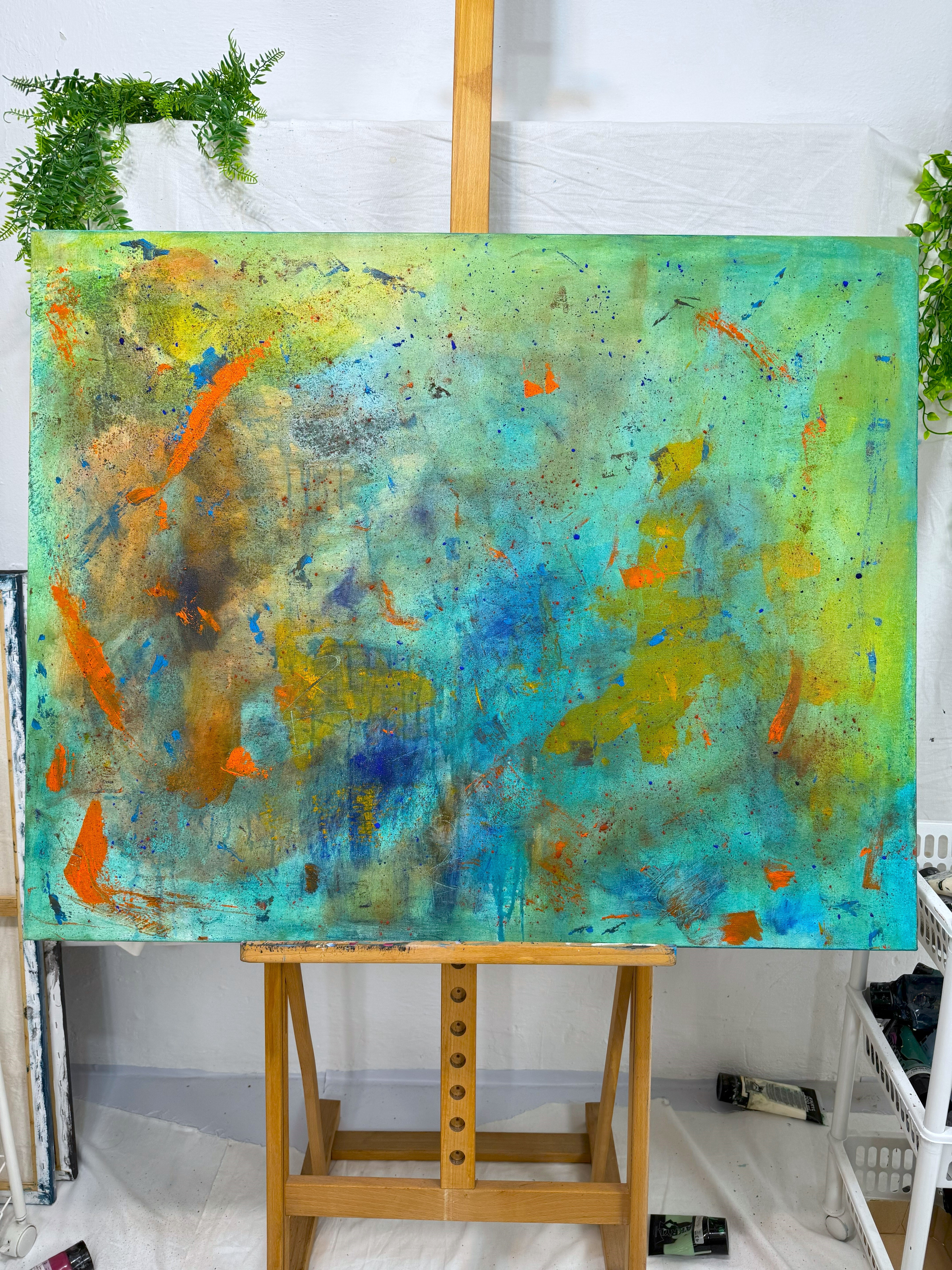 Akryl, pigment w proszku. Obraz namalowany na płótnie bawełnianym. Blejtram wykonany z lekkiego drewna sosnowego. Boki obrazu zamalowane, dzięki czemu nie wymaga zakupu ramy.
