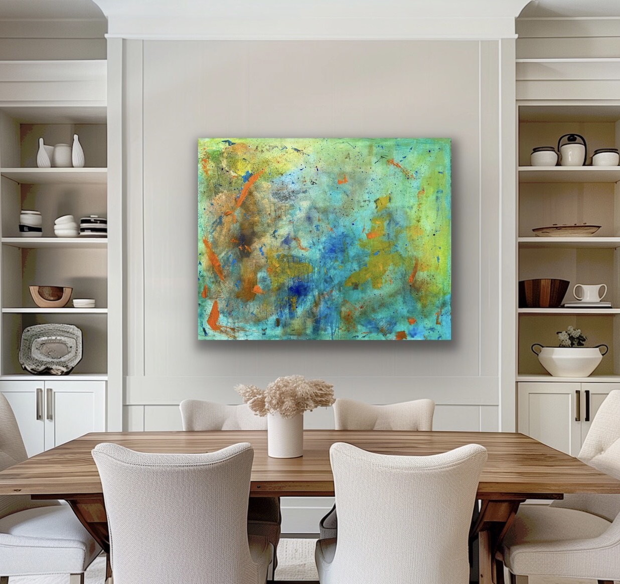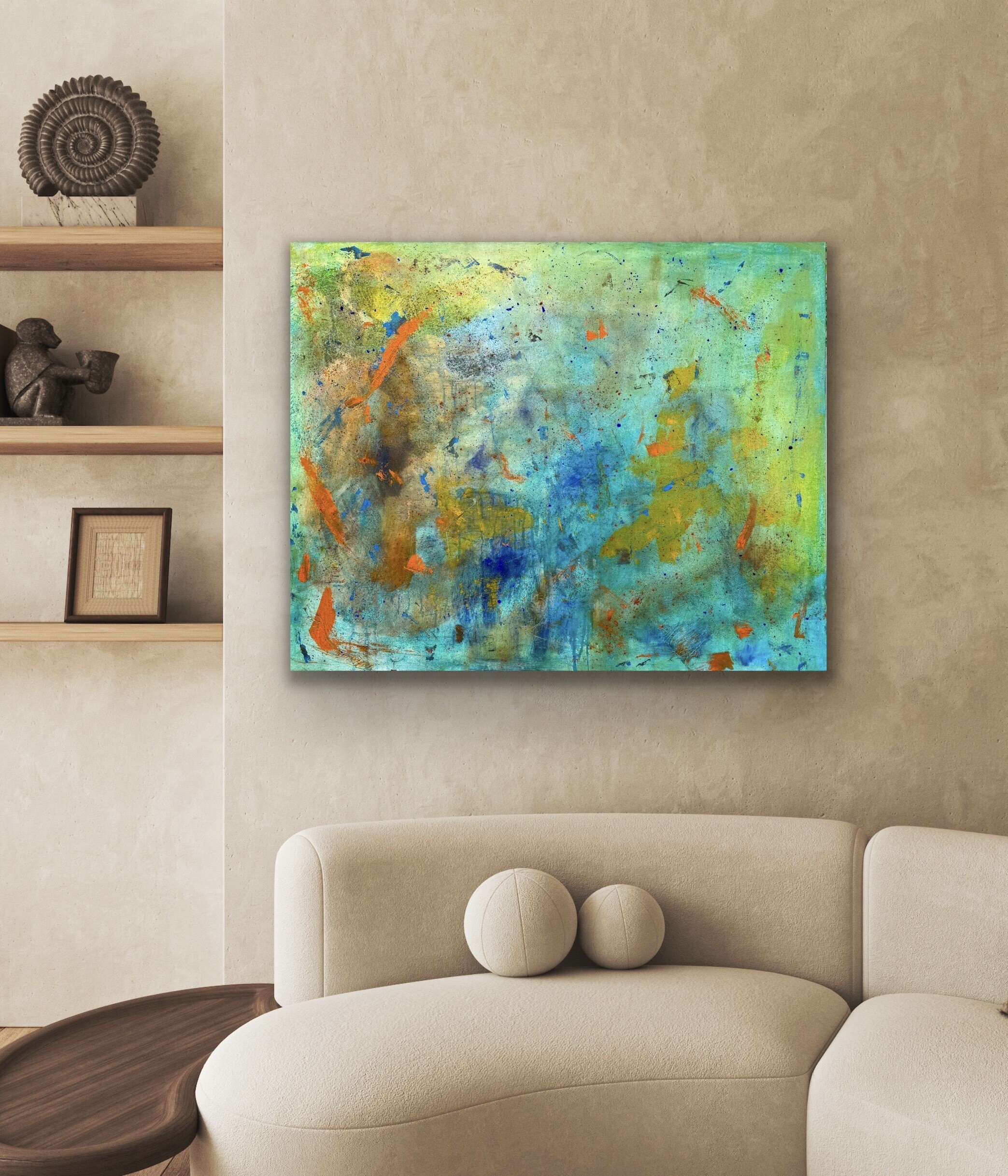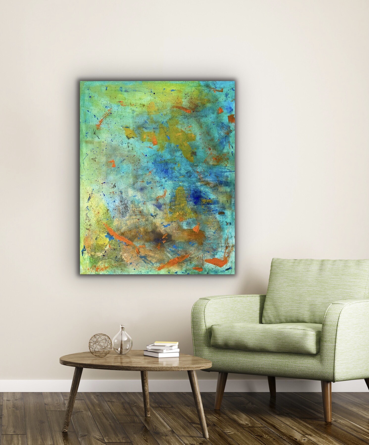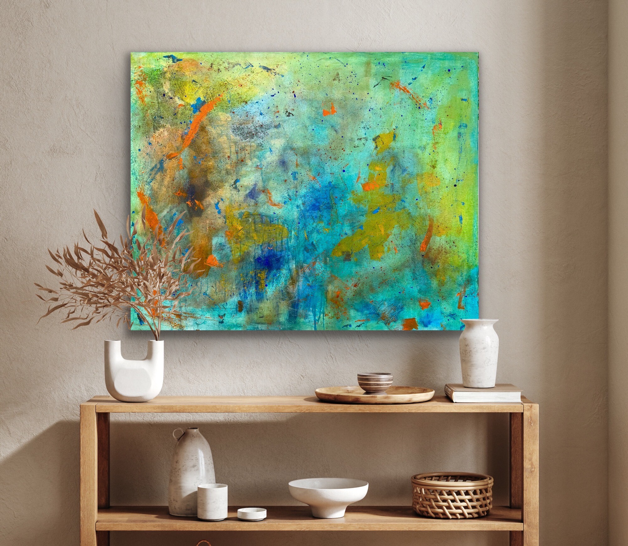 Akryl, pigment w proszku. Obraz namalowany na płótnie bawełnianym. Blejtram wykonany z lekkiego drewna sosnowego. Boki obrazu zamalowane, dzięki czemu nie wymaga zakupu ramy.